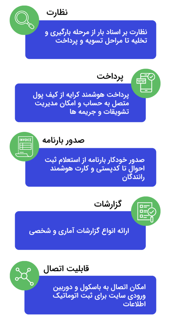 امکان صدور فوری، آنلاین و سیستمی بارنامه بوسیله استعلامگیری. کدملی از ثبت احوال،کدپستی از اداره پست و شماره هوشمند راننده از سازمان راهداری
